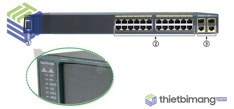 Các đèn LED chuyển đổi bao gồm SYST, RPS, Trạng thái, Duplex và đèn LED tốc độ.